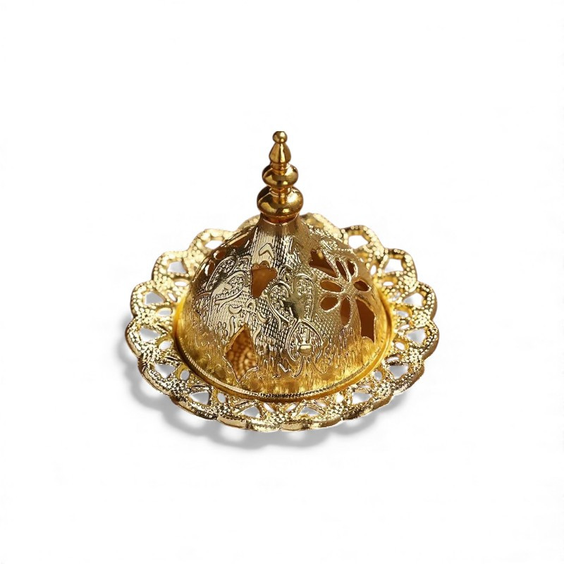 Sa coupole sculptée rappelle les encensoirs traditionnels des pays du Golfe : une structure dorée brillante, finement travaillée, laissant la fumée s’échapper doucement à travers des ouvertures décoratives. Son plateau circulaire, délicatement ciselé, sécurise l’ensemble tout en ajoutant un charme visuel immédiat. Cet encensoir devient non seulement un outil de parfumage, mais aussi un véritable élément décoratif.