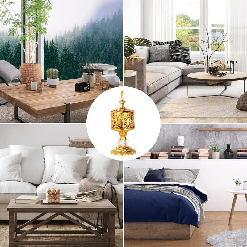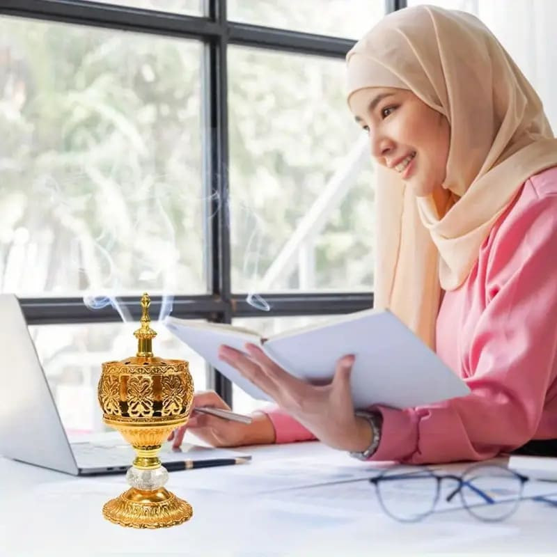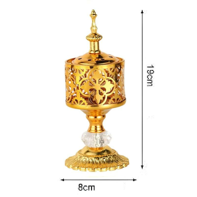 Encensoir oriental doré sur pied (19 cm), brûleur d’encens raffiné pour bakhour et cônes parfumés.