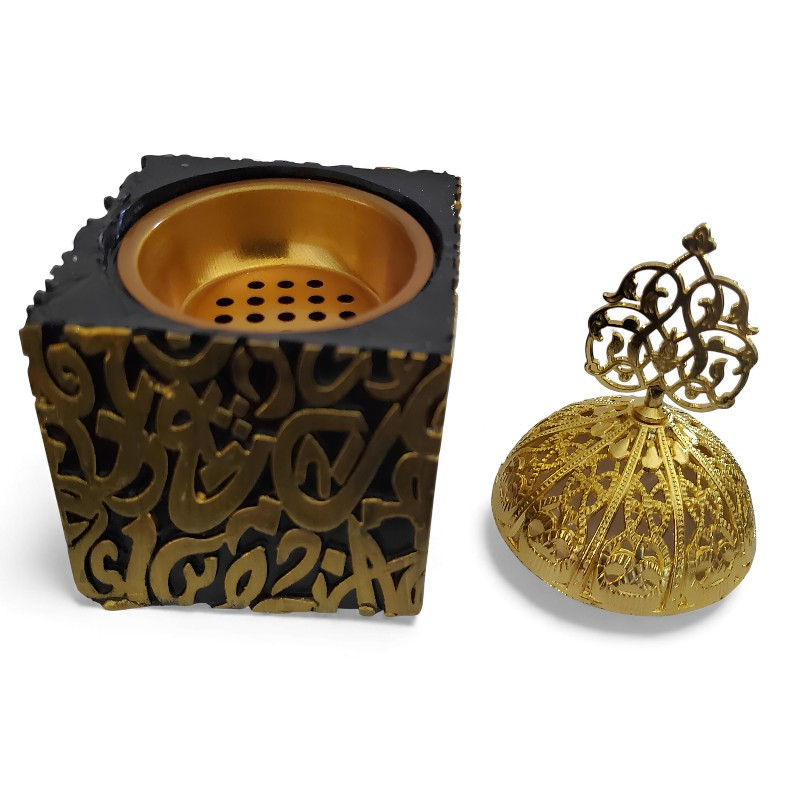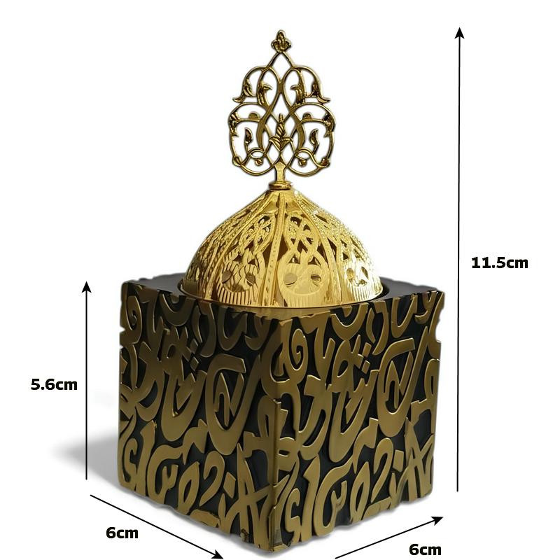 Avec sa base carrée de 6 × 6 cm et une hauteur totale d’environ 11,5 cm, il trouve facilement sa place dans un salon, une chambre ou un coin prière. Sa coupole dorée finement travaillée diffuse les senteurs tout en laissant apparaître la lumière et la fumée, créant une atmosphère chaleureuse et enveloppante.
