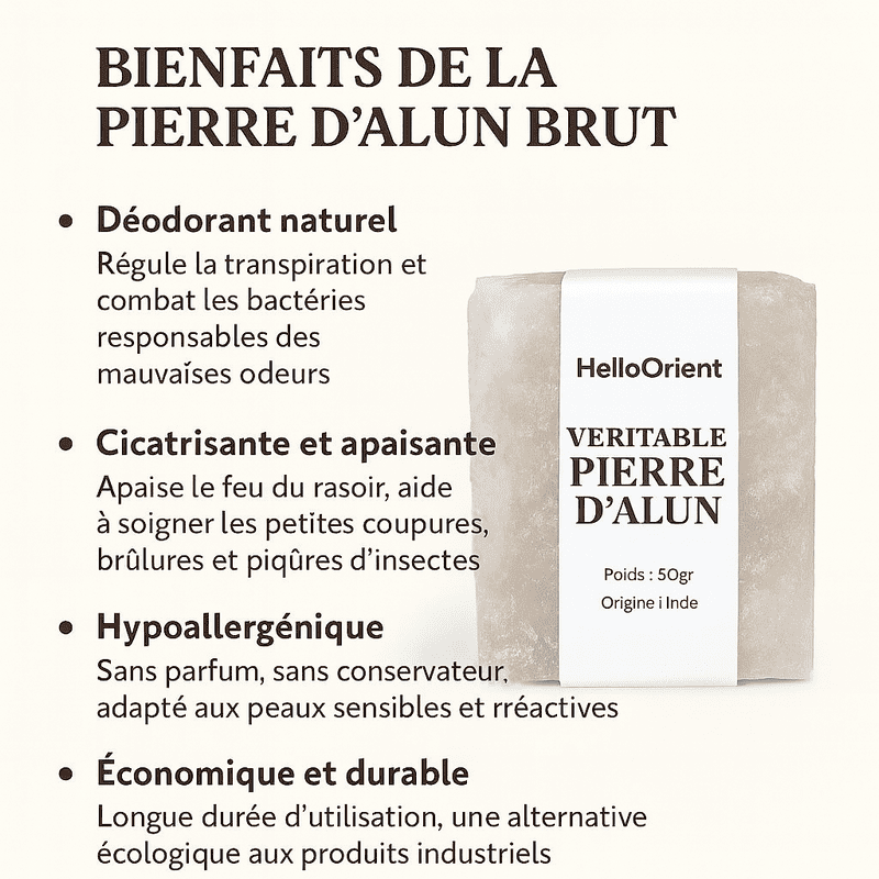 Pierre d’alun brute 50 gr d’origine Inde, sans parfum, idéale pour peaux sensibles et usage longue durée.
