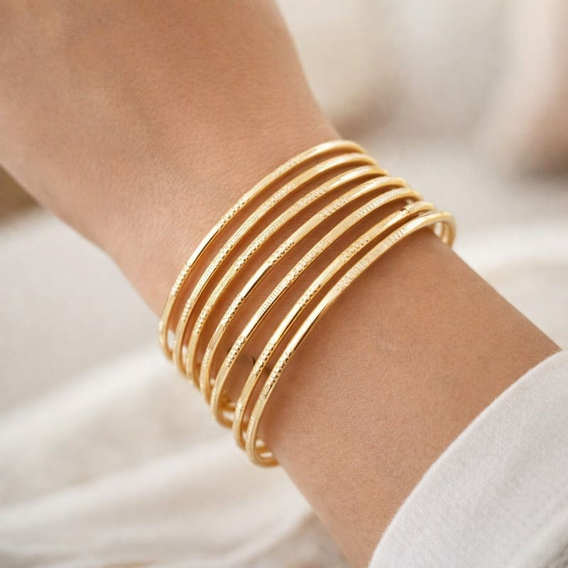Semainier plaqué or composé de 9 joncs fins reliés, diamètre 7 cm. Léger, sonore, idéal au quotidien