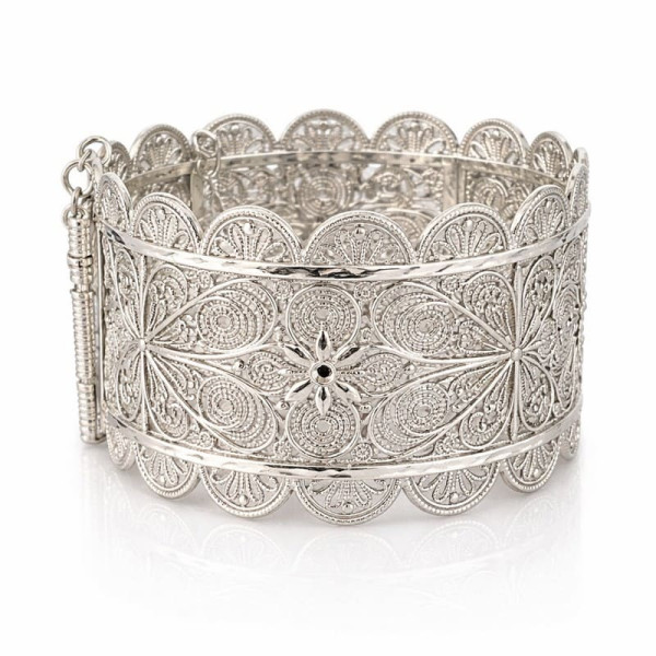 Bracelet manchette oriental argenté filigrané floral, large et rigide, style traditionnel élégant.