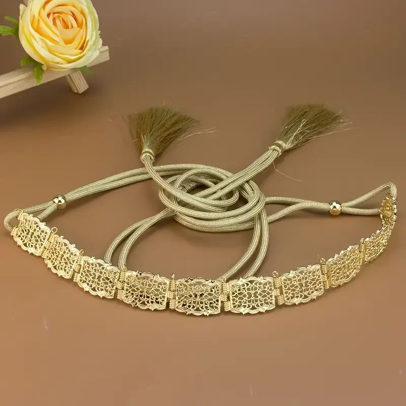 Ceinture plaqué or femme articulée avec 20 maillons ajourés, cordon doré 160 cm et franges.