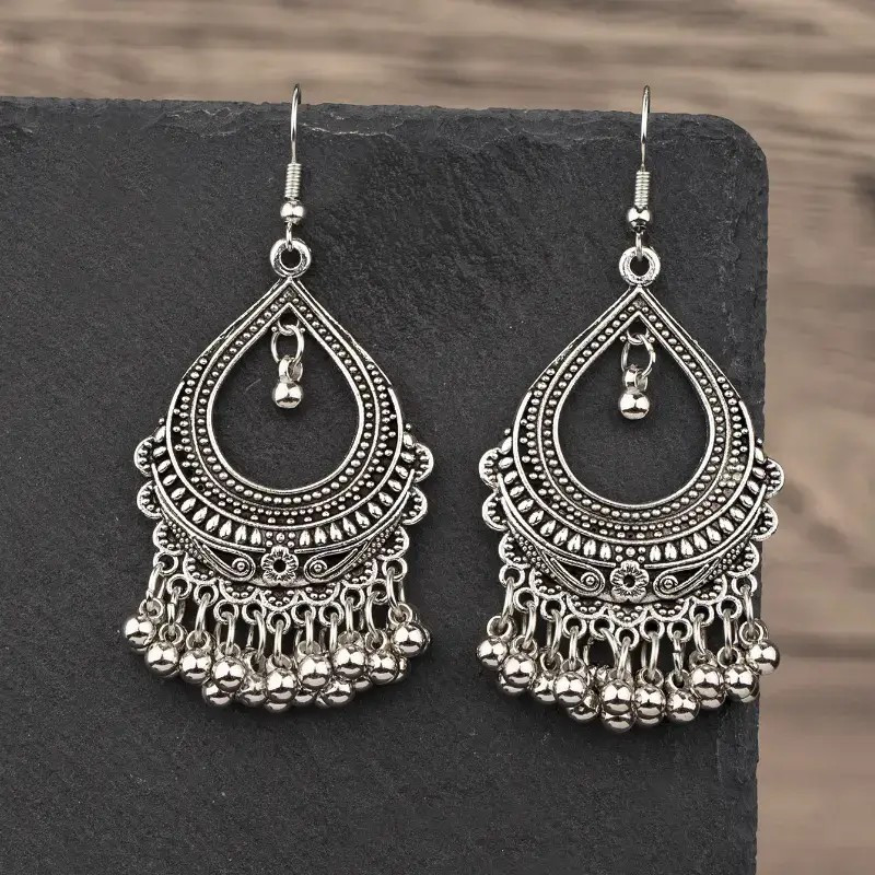 Ces boucles d’oreilles indiennes incarnent toute la grâce des bijoux orientaux traditionnels. Fabriquées dans un alliage argenté au fini patiné, elles se distinguent par leurs motifs finement ciselés et leurs petites breloques suspendues, qui créent un délicat tintement à chaque mouvement.