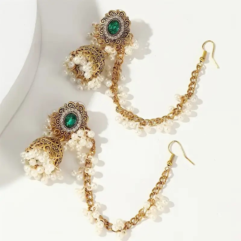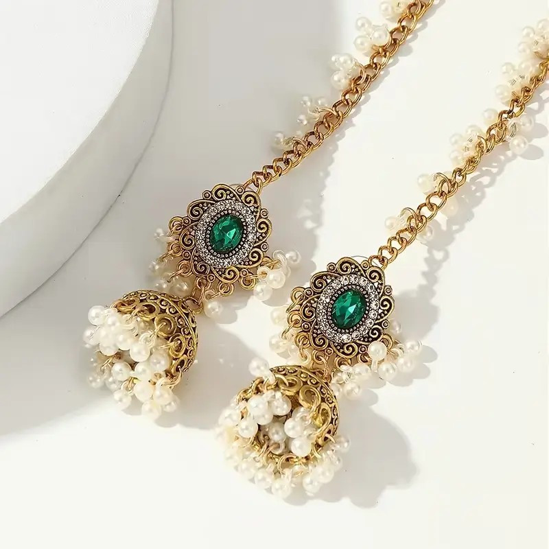 Chaque détail de ces boucles d’oreilles témoigne d’un savoir-faire raffiné. Le mélange du doré et du vert, les perles pendantes et la chaîne décorative rappellent les bijoux de cour indienne. Portées avec une robe orientale ou un sari traditionnel, elles insufflent un charme royal et une touche de mystère.
