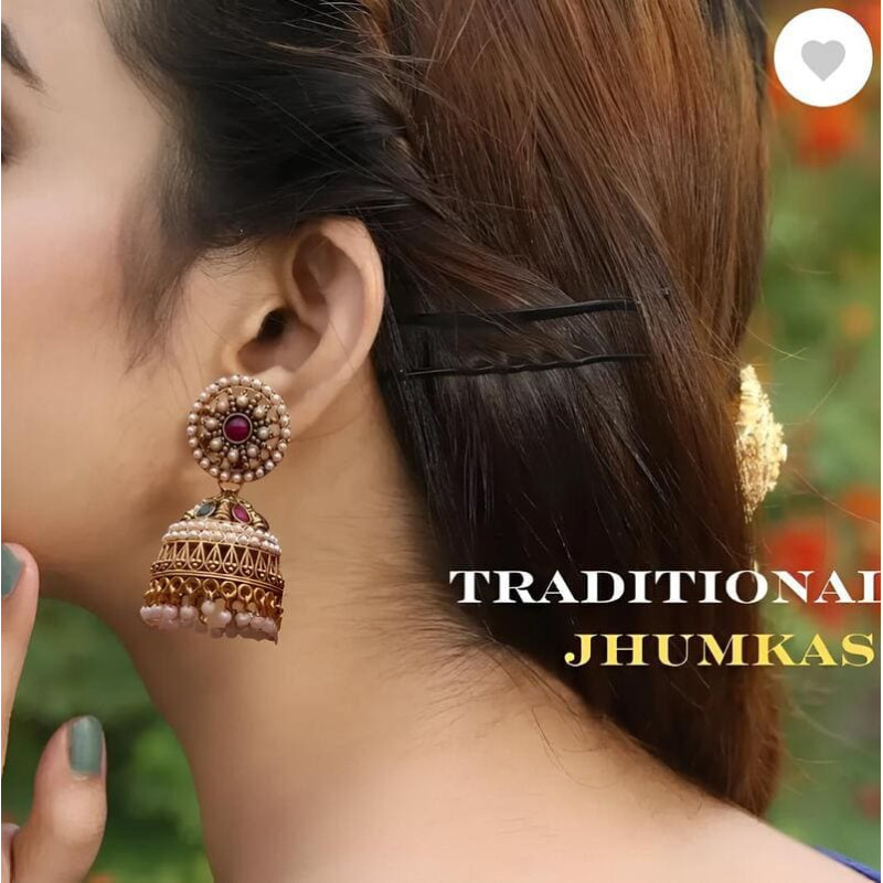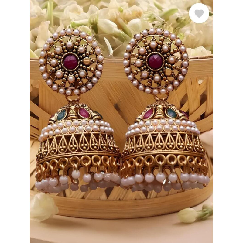 Boucles d’oreilles jhumka dorées, perles blanches et pierres colorées pour tenue indienne élégante.