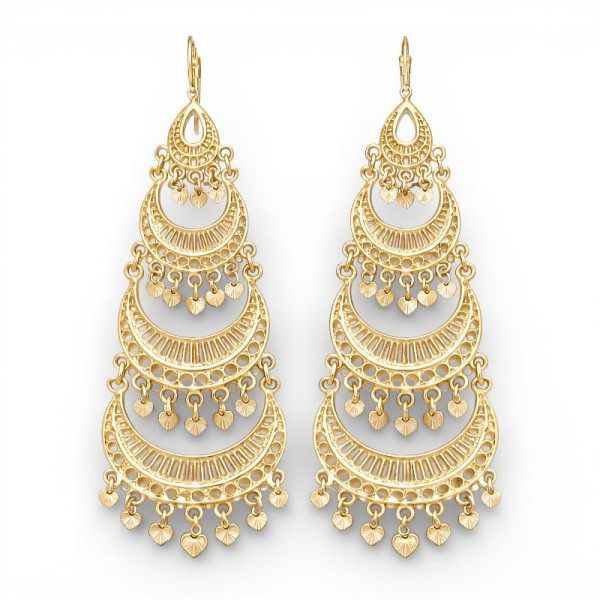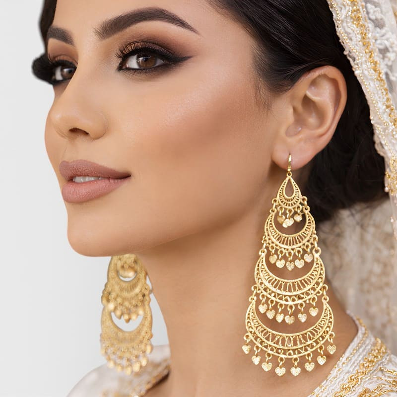 Hautes de 10 cm, ces boucles d’oreilles sont façonnées en métal recouvert de plaqué or au fini délicatement poli. Leur structure ajourée, inspirée des motifs d’architecture orientale, apporte relief et profondeur. Les breloques mobiles diffusent un tintement discret, rappelant les parures anciennes des danseuses orientales et les ornements princiers d’Inde et du Maghreb.