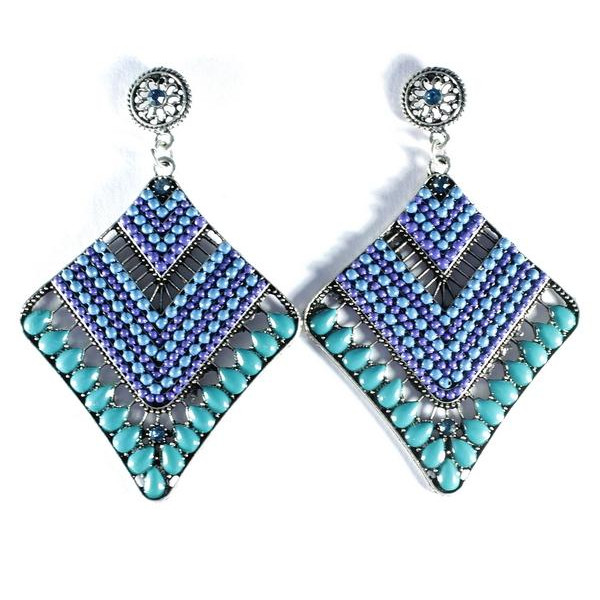 Une forme losange qui suit les lignes du visage, des minis strass , des rocailles: une belle alliance des matières qui fait de cette boucle d'oreille aux inspirations ethniques un accessoire à marier avec une robe bohême colorée ou une tenue indienne Bollywood.