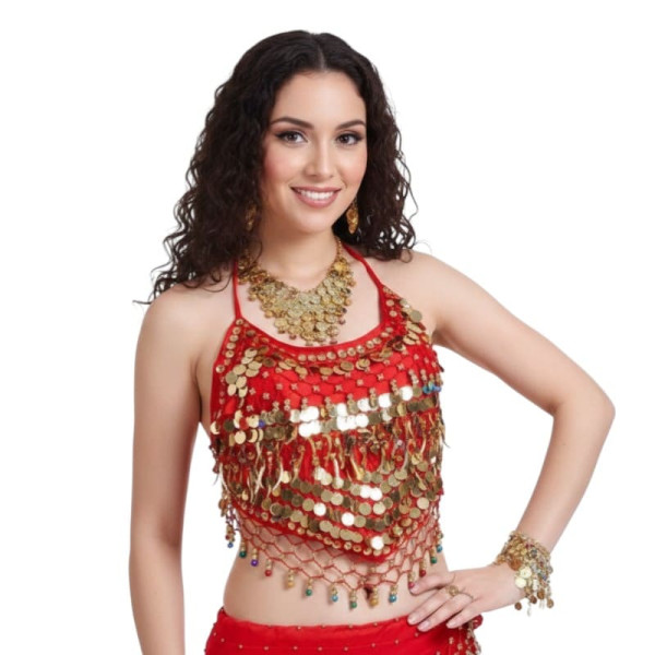 Top de danse orientale couvrant un partie du ventre, dos nu, qui se noue dans le cou et dans le dos à l'aide de deux liens en tissu.