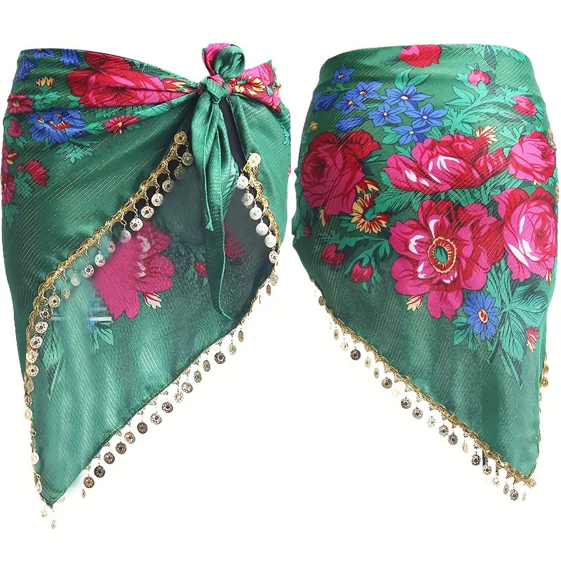 Ajoutez une touche de fraîcheur et d’élégance à vos chorégraphies avec cette ceinture de danse orientale triangulaire en vert profond. Son imprimé floral lumineux, son galon doré et ses sequins scintillants en font un accessoire aussi esthétique qu’utile, parfait pour vos cours, répétitions et spectacles.