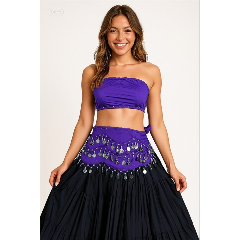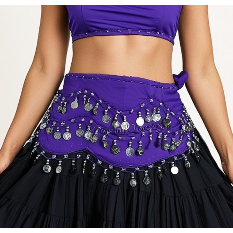 Ceinture danse orientale violette pas cher avec sequins argentés – 150 cm, légère et fluide.