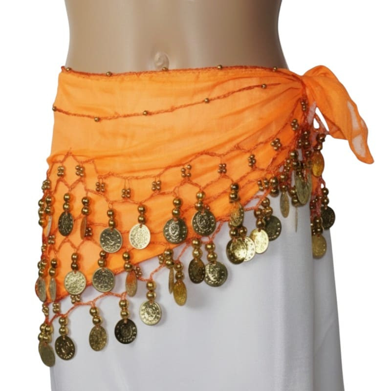Cette ceinture orange à sequins dorés est parfaite pour les premiers pas en danse orientale. Sa couleur vive et son scintillement doré créent un effet visuel impressionnant sous les lumières de la scène. Elle peut être portée avec une jupe, un pantalon de danse ou un ensemble assorti.