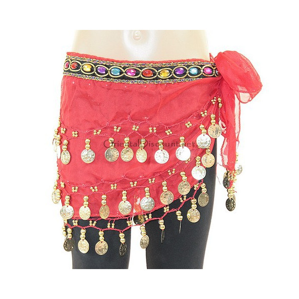 Ceinture de danse orientale pour enfants, taille enfant, composée de pierres colorées et de sequins dorés réalisée dans un tissu mousseline très léger pour les entraînements et spectacle.