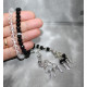 Des petites breloques assorties en forme de feuille acccrochées aux dernières perles donnent un aspect oriental à ce très joli chapelet 100% tendance.