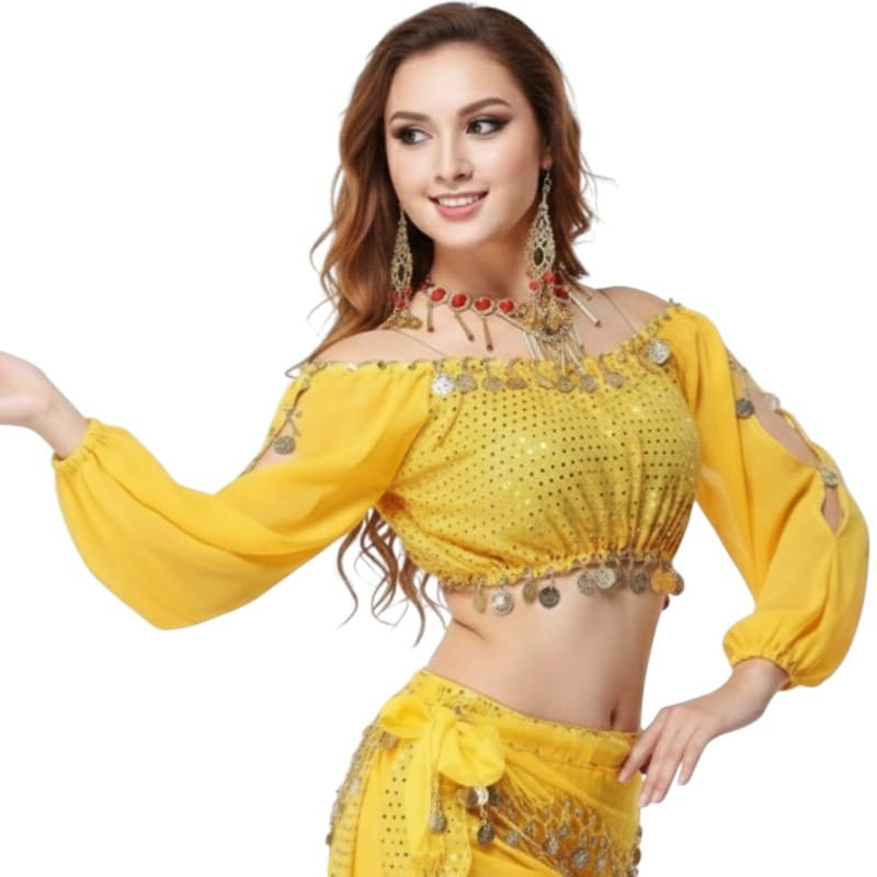 Voilà un joli top brillant dans les tons vifs, muni de mini paillettes qui vous sera bien utile pour complèter une tenue de soirée, un costume de danse, un sari indien...