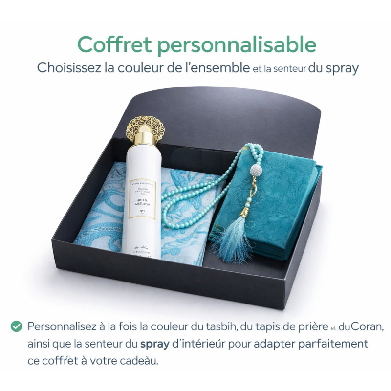 Coffret cadeau musulman personnalisable avec Coran, tapis de prière, tasbih et spray d’intérieur.