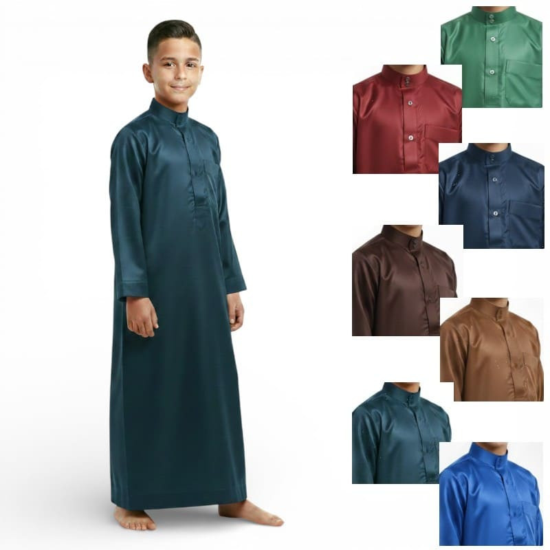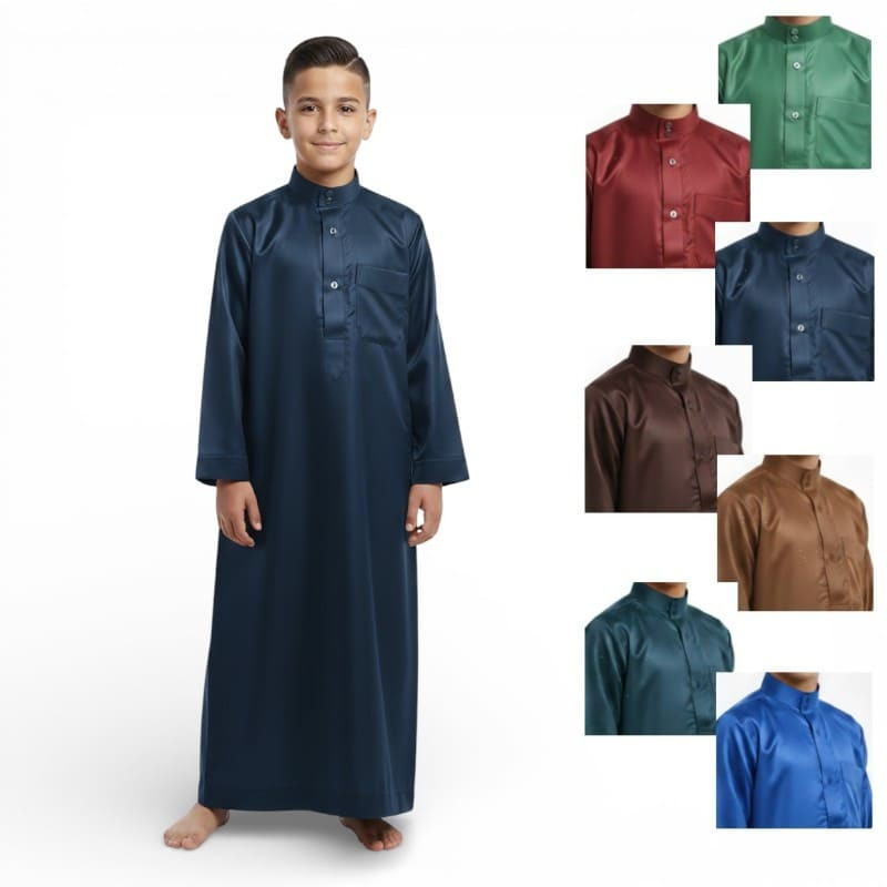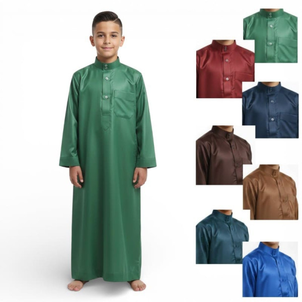 Ce qamis enfant saoudien satiné est pensé pour offrir une tenue élégante, fluide et confortable aux jeunes garçons. Son tissu légèrement brillant apporte une finition raffinée, idéale pour les occasions importantes comme pour un port soigné au quotidien.