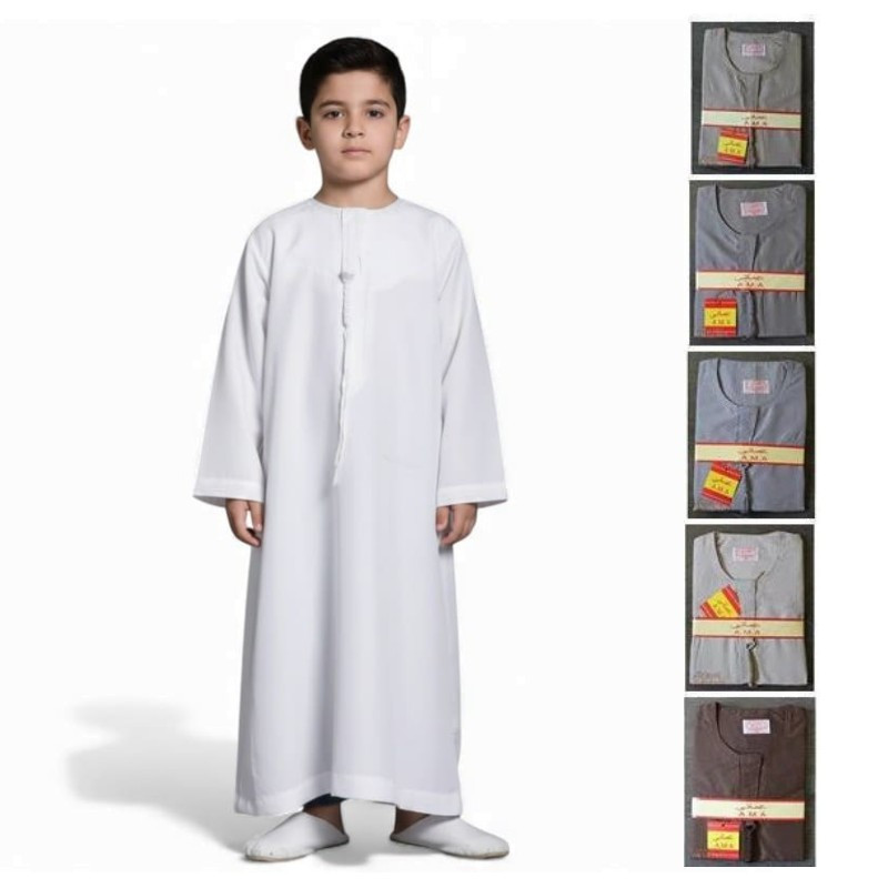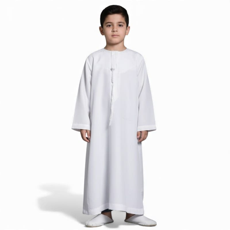 Ce kamis enfant s'enfile par la tête et se ferme à l'aide d'une boutonnière au niveau de l'encolure.