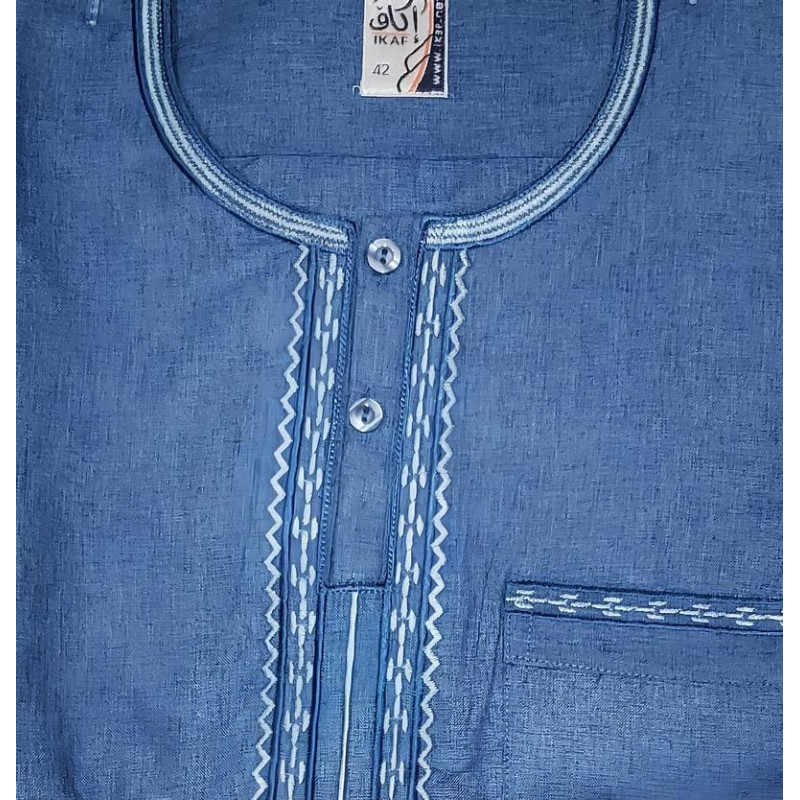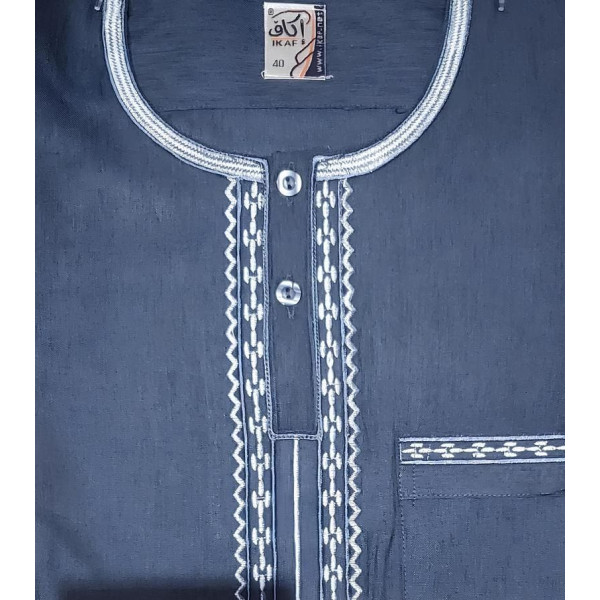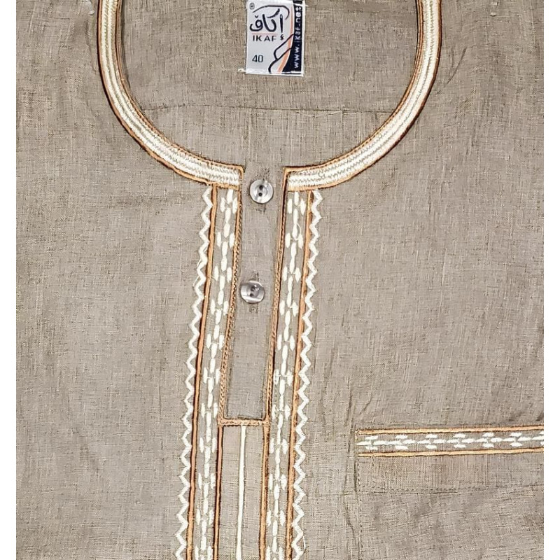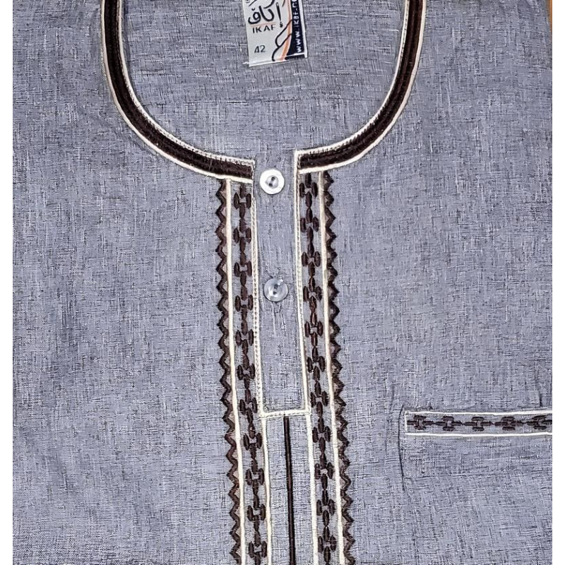 Qamis enfant manches longues avec pantalon assorti en tissu chiné 100 % polyester, broderies au col, boutons et poches pratiques, idéal pour la prière, l'école coranique ou les fêtes.