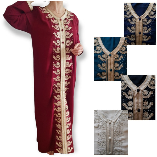 Ornée de de jolies broderies formant des arabesques au cordon couleur or, sur toute la face avant , cette robe orientale est réalisée dans un tissu style mousseline plutôt épais et opaque à la fois très qualitatif.