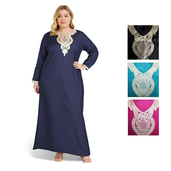 Le col rond brodé met en valeur le port de tête sans dévoiler la poitrine, et les manches longues légèrement resserrées assurent un tombé fluide et élégant.