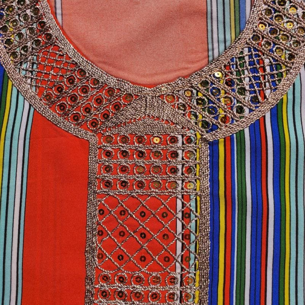 Djellaba femme rayée, coupe ample et broderie élégante, en tailles M/L et XL/XXL.