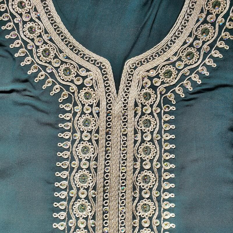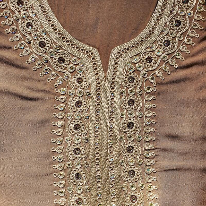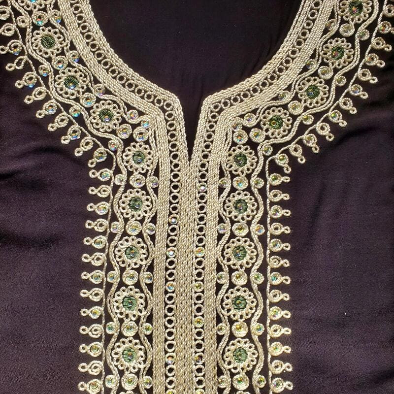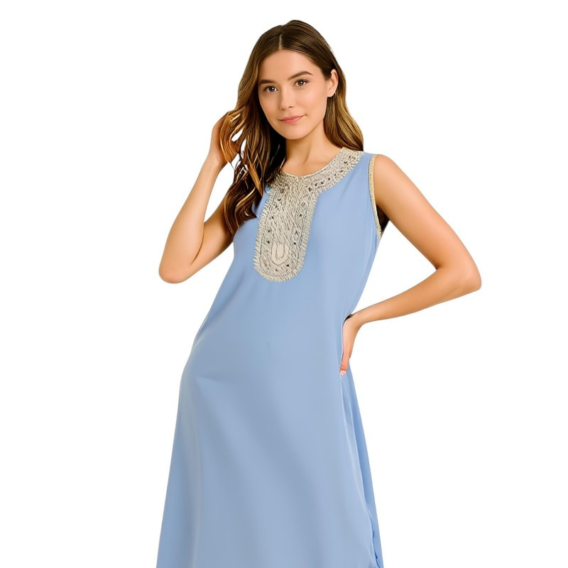 Djellaba femme maison légère, manches style débardeur, galon brillant chic, 6 coloris disponibles.