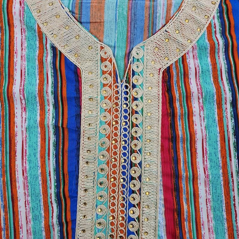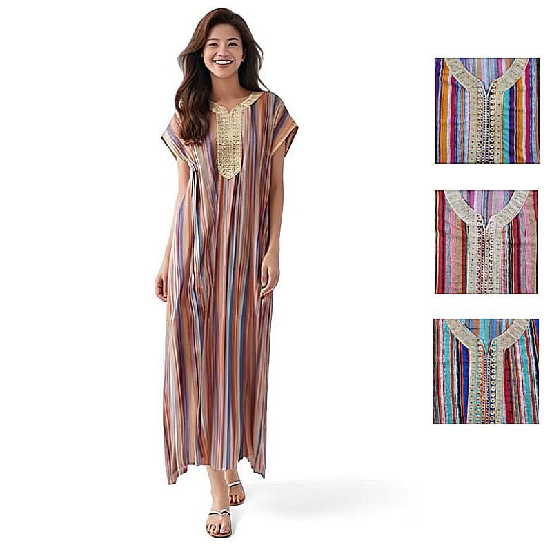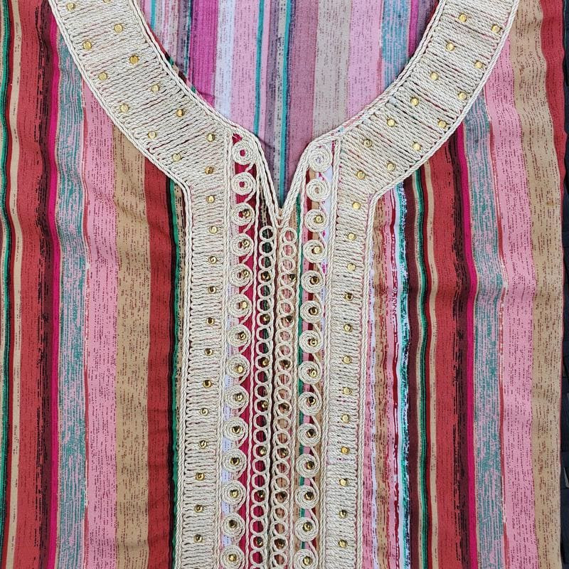 Djellaba maison femme rayée, col brodé raffiné, coupe ample et confortable du S au 2XL.
