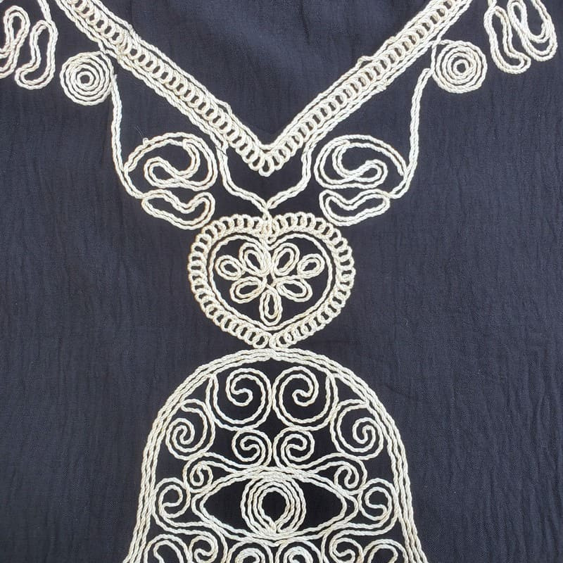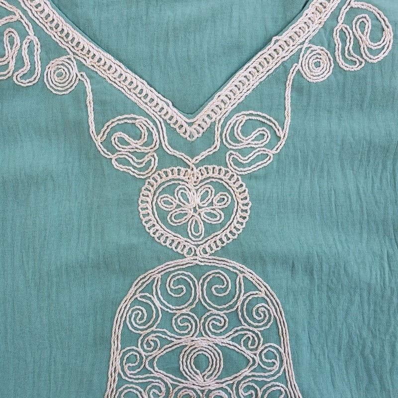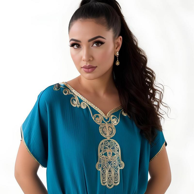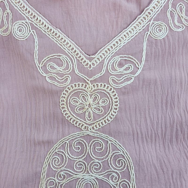 Djellaba femme ample brodée main de Fatma beige, chic et confortable, disponible en plusieurs tailles.