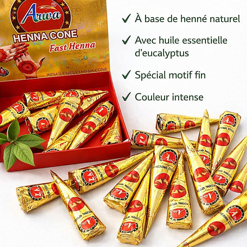 Boite de 12 Cônes de henné naturel Arwa prêt à l’emploi pour motifs mehandi précis. Formule enrichie à l’huile essentielle d’eucalyptus pour tatouage temporaire sur mains et pieds.