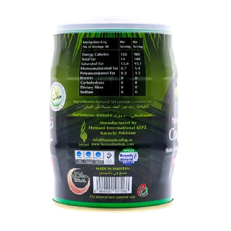 Huile de coco vierge Hemani 400 ml, obtenue par pression à froid. Nourrit la peau sèche, protège les cheveux abîmés et préserve l’hydratation naturelle. Utilisable visage, corps et cheveux. Texture douce, usage quotidien, formule pure à base de noix de coco sri-lankaise.