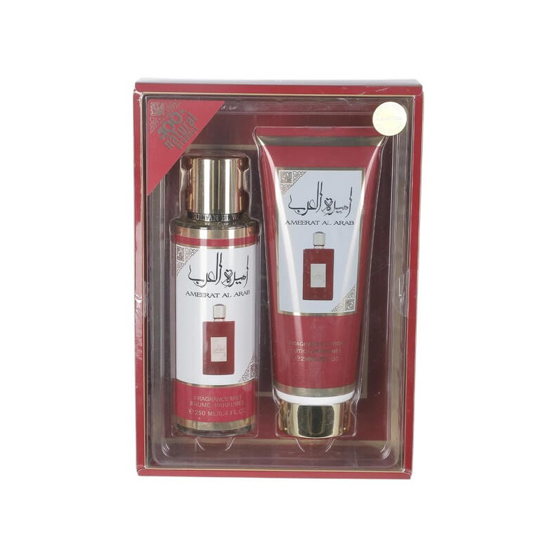 Coffret Ameerat Al Arab avec brume parfumée et lotion corps pour un rituel sensoriel complet.