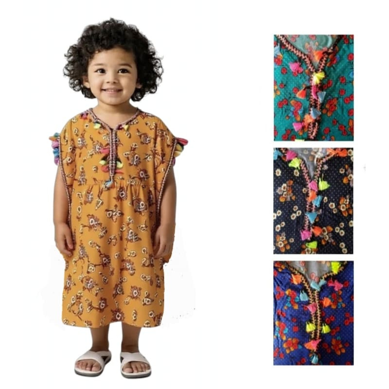 Djellaba fille à motifs fleuris, pompons colorés, disponible en plusieurs coloris du 2 au 10 ans.