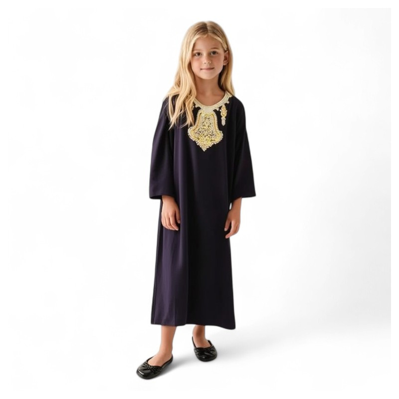 Djellaba fille manches longues 4-14 ans, décor doré oriental, 5 coloris au choix.