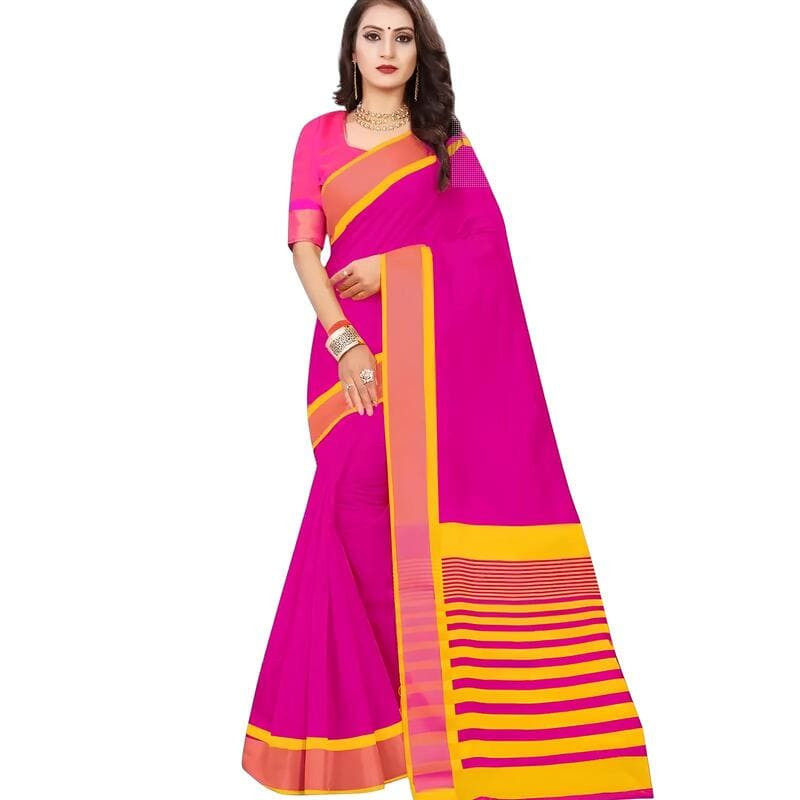 Le fuchsia vibrant évoque la féminité et la joie, tandis que l’ocre chaud rappelle les tonalités dorées de l’artisanat indien. La bordure ocre et corail souligne le drapé avec élégance, créant un équilibre parfait entre modernité et héritage culturel. Le jeu de bandes contrastées sur la partie inférieure du sari accentue le mouvement et allonge la silhouette avec finesse.