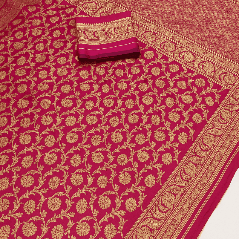 Sari indien fuchia et doré femme en viscose satinée, coupon à draper avec choli à coudre.