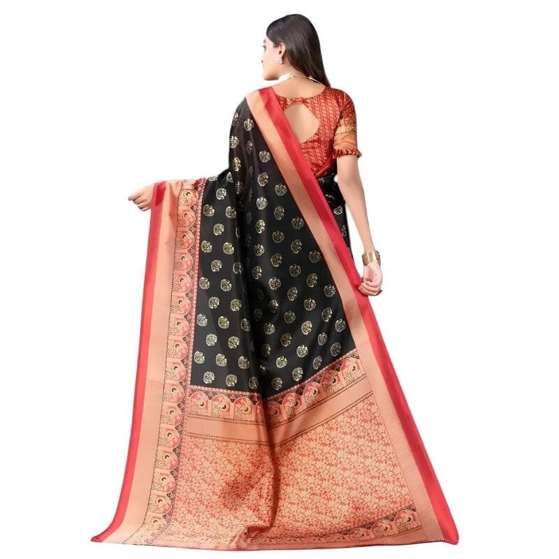 Le noir satiné évoque la noblesse et la force, tandis que le rouge profond symbolise la joie et la prospérité. La bordure dorée brodée crée un cadre lumineux qui accentue le drapé et valorise chaque mouvement. Cette combinaison raffinée, typique des saris de célébration, en fait une pièce de choix pour les grandes occasions.