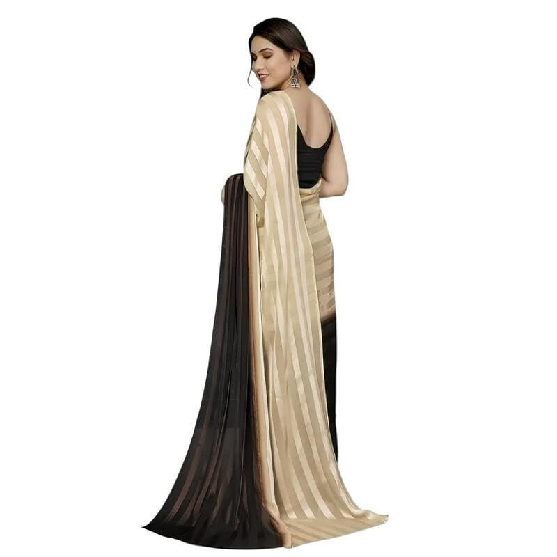 Sari indien dégradé chocolat beige à rayures, tissu fluide à draper, raffiné et moderne