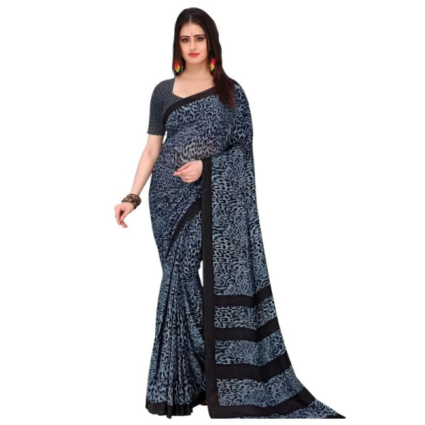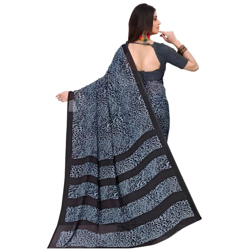 Sari indien fluide gris et noir à motif léopard, élégant, moderne, confortable et facile à draper.