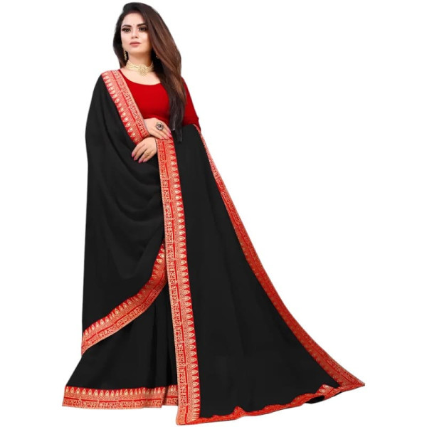 La profondeur du noir met en valeur une bordure rouge intensément décorée, inspirée des motifs traditionnels indiens. Le rendu est à la fois raffiné, structuré et visuellement fort, idéal pour une cérémonie, une fête familiale ou un événement culturel.