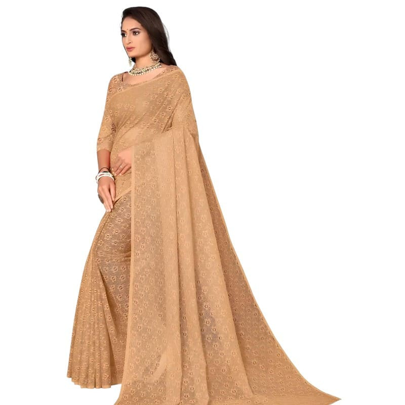 Sari indien dentelle caramel clair, coupon fluide à coudre avec choli assorti, rendu raffiné.