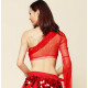 Costume 3 pièces rouge à volants, fluide, intense et scintillant avec top asymétrique.