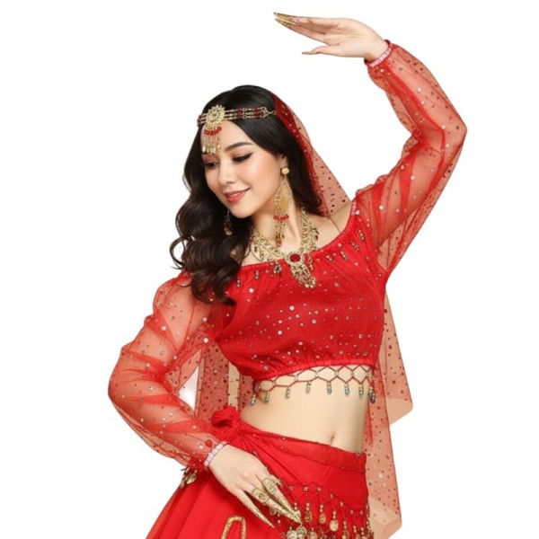 Vous serez subjuguée par cette brassière de danse orientale élastiquée , à manches longues, entiérement fabriquée dans du tulle parsemé de pastilles argentées brillantes, et réfléchissant la lumière.