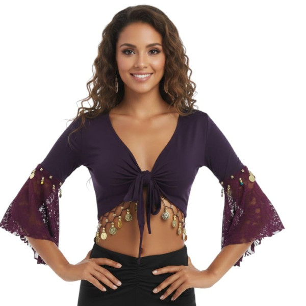 Top à nouer autour du buste pour compléter un costume danse orientale , à manches voilées en dentelle, ornées de perles de couleur et de sequins dorés.