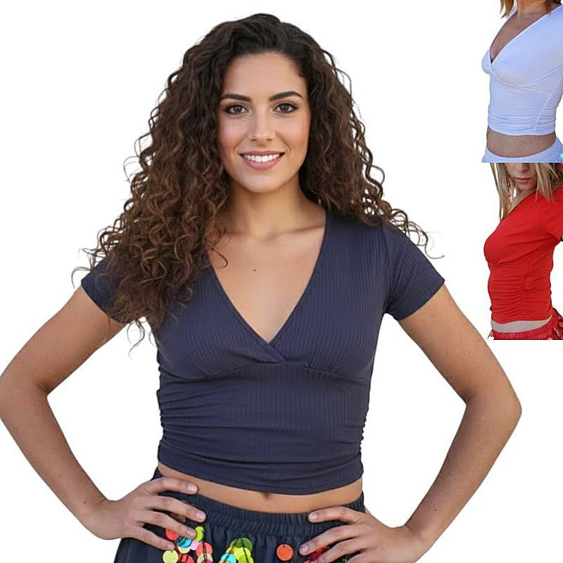 Découvrez le top façon cache-cœur côtelé à manches courtes, la pièce incontournable pour vos tenues de cours, de yoga ou de fitness.
