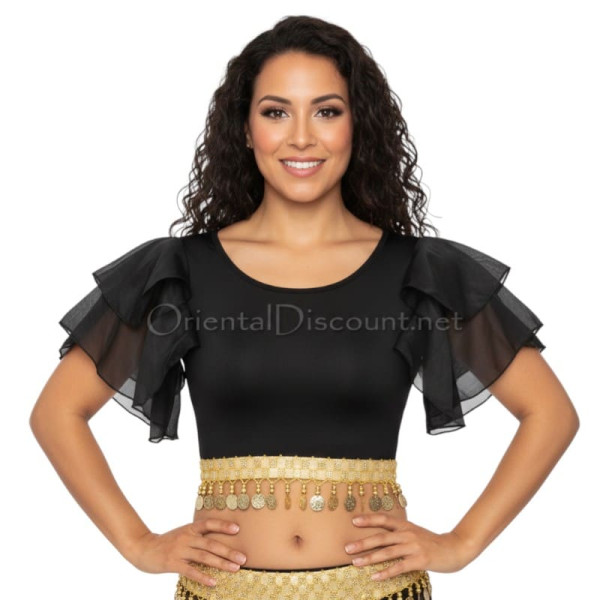 Top de danse orientale en lycra et manches courtes voilées, élastiqué au niveau du ventre et orné de sequins dorés.
