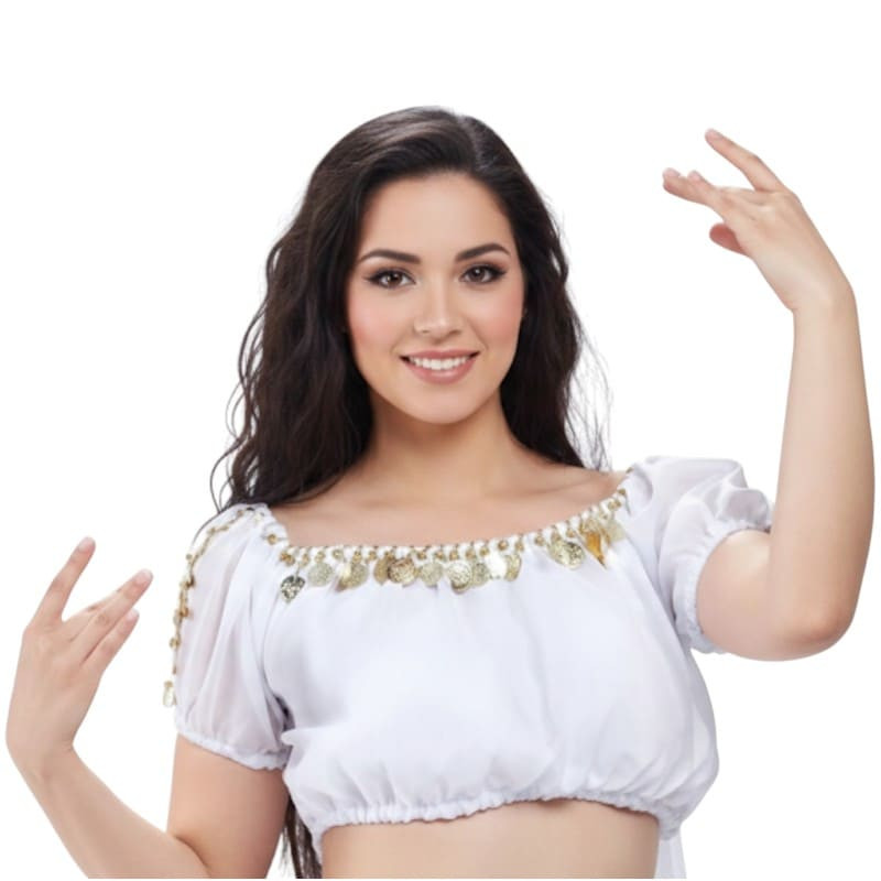 Top pour vos cours , à manches courtes, entiérement élastiqué et décoré de sequins dorés.