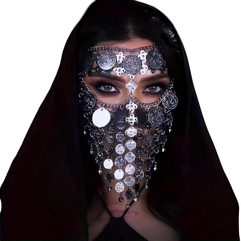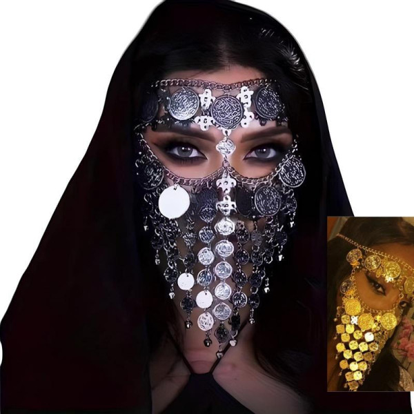 Ce sublime cache visage orné de piècettes frappées couleur or ou argent est parfait pour compléter une robe de danse orientale ou un costume de scène.