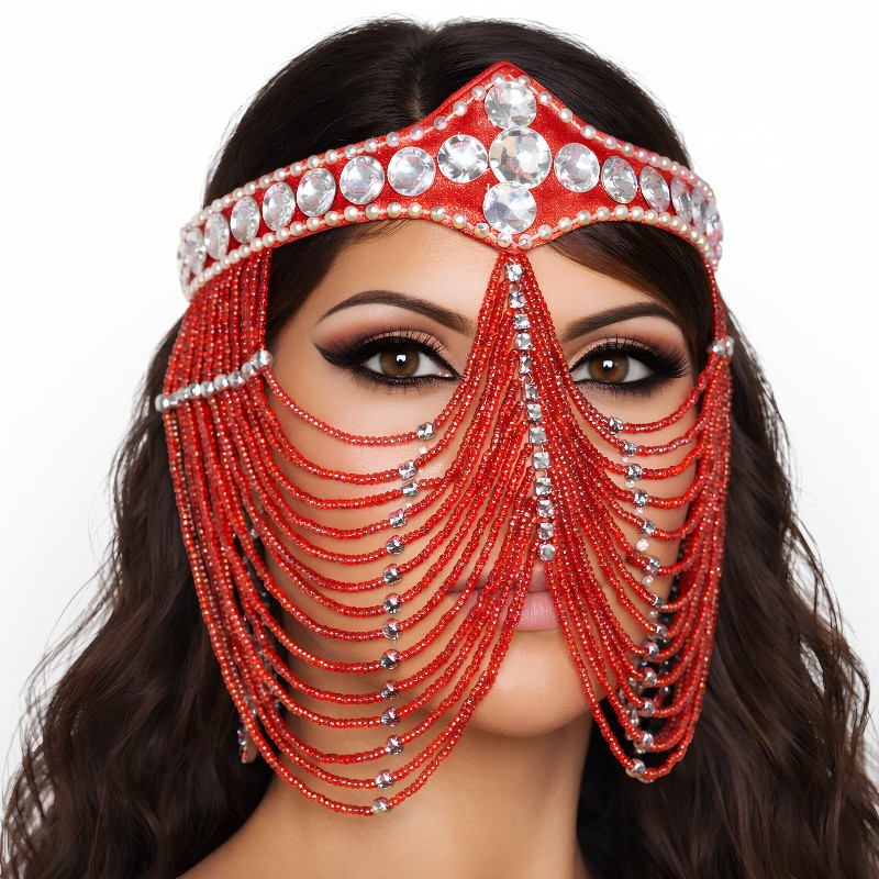 Masque de danse orientale orné de strass sur le tour de tete et de franges perlées qui recouvrent le visage.